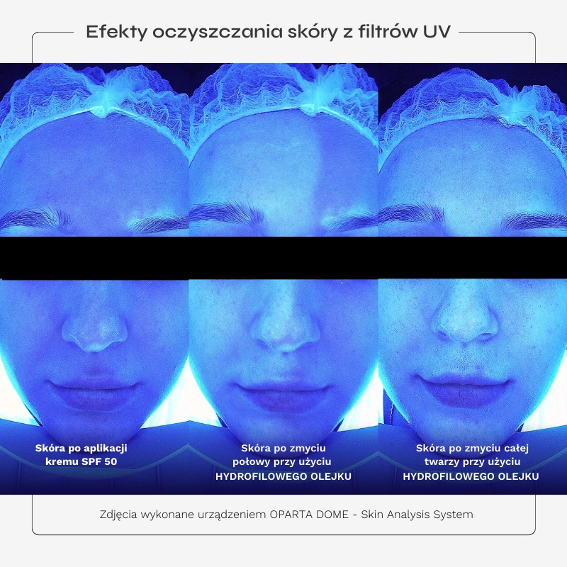 Zdjęcia wykonane przy użyciu urządzenia OPARTA DOME - Skin Analysis System. W celu oceny skuteczności usuwania kosmetyku promieniochronnego wykorzystano światło UV. W świetle tym kosmetyki promieniochronne widoczne są jako maskująca warstwa na skórze odbijająca światło na niebiesko/granatowo. Na zdjęciu po lewej widoczna jest skóra probantki po aplikacji kremu SPF 50, a na zdjęciu po prawej - po umyciu skóry olejkiem. Przeprowadzone badanie potwierdza, że HYDROFILOWY OLEJEK DO DEMAKIJAŻU skutecznie oczyszcza skórę z filtrów UV (kosmetyków promieniochronnych).